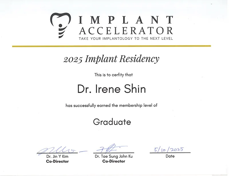 Dr. Irene Shin went to the University of Maryland to earn her Bachelor of Science in Biology. Dr. Shin pursued additional research trainings, studying stem cell research at the National Institutes of Health (NIH) and published scientific peer reviewed journals. She attended the University of Michigan School of Dentistry, the #1 ranked dental school in the United States and in the world, according to QS World University Rankings. Dr. Shin received an advanced dental implant certificate in October 2024. In her spare time, she spends her free time with her family and her daughter.